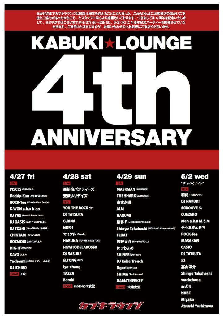 ・4/28(土) 4周年パーティ@ 新宿カブキラウンジ【DJ】
